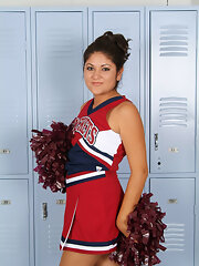 Pretty brunette cheerleader takes off panty and poses on the floor