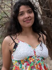 Maria F is outdoors in her pretty dress and showing off her body. She strips off her dress and shows her floral lingerie She takes it all off and poses naked in the sun and showing us her hairy pussy.