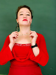 Lori Buck is sitting on her wooden desk in her purple dress. She is sexy and alluring, and doesn\'t shy from showing her body. She spreads her legs and shows everyone her hairy legs and pussy there.