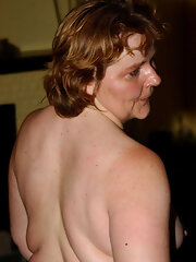 Shorthaired chubby older woman with hairy pussy poses in pantyhose
