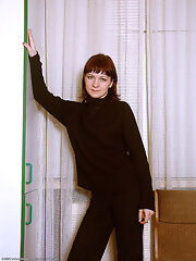 Redheaded retro babe with hairy cunt undresses and poses naked