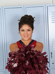 Pretty brunette cheerleader takes off panty and poses on the floor